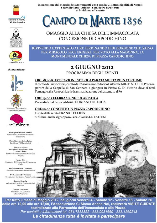 In occasione del Maggio dei Monumenti di Napoli, per dare luce all’antica Piazza Capodichino e all’adiacente Chiesa dell’Immacolata Concezione, l’Associazione Ci Siamo Anche Noi, ha organizzato, oltre alle visite guidate in loco ogni fine settimana di maggio 2012, per il giorno 2 giugno, alle ore 18,00, la RIEVOCAZIONE STORICA in costumi d’epoca dell’attentato al Re FERDINANDO II DI BORBONE, con parata militare e drammatizzazione musicale dell’evento che diede origine alla fondazione dell’antica chiesa, nata come ex voto per lo scampato attentato al penultimo Re Borbone delle due Sicilie.