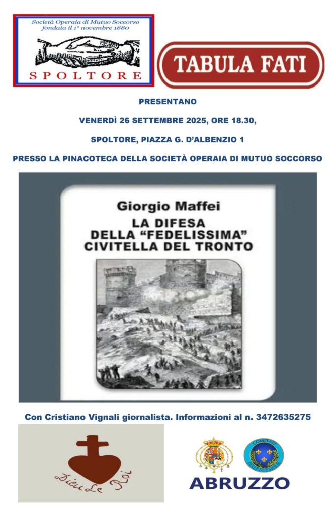 Spoltore – Venerdì 26 settembre 2025 alle 18.30, il giornalista e saggista storico Cristiano Vignali presenterà nella Pinacoteca della Società di Mutuo Soccorso (SOMS) di Spoltore, presieduta dall’Avv. Luigi Spina il libro di Giorgio Maffei “La Difesa della “Fedelissima” Civitella del Tronto” (Tabula Fati Editore di Marco Solfanelli ).